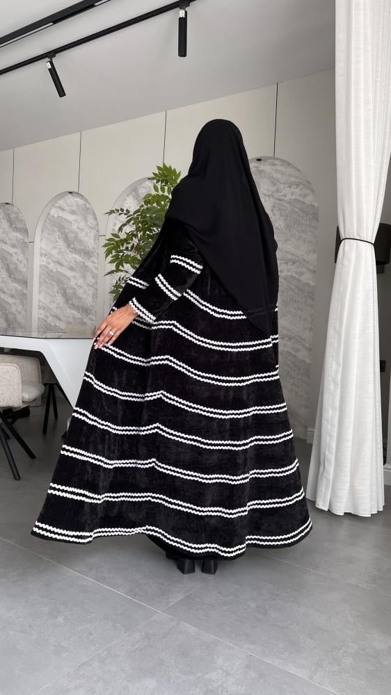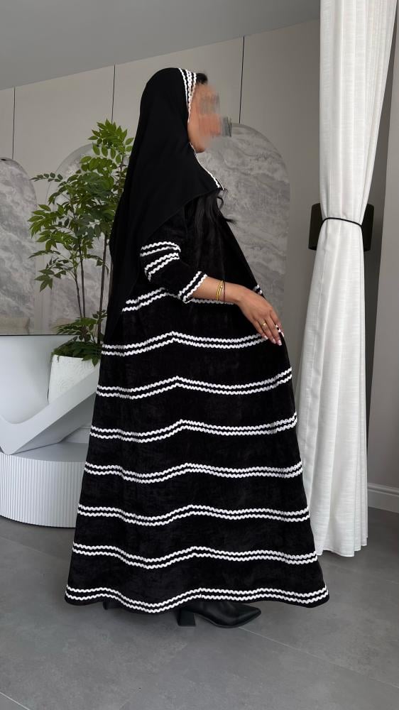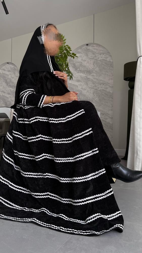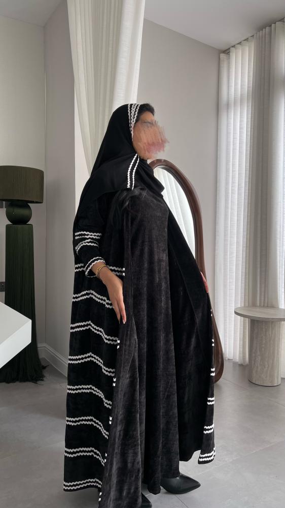 عباية بقماش جوخ باللون الأسود بتطريز كلفه باللون الأبيض فستان من نفس القماش