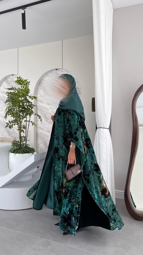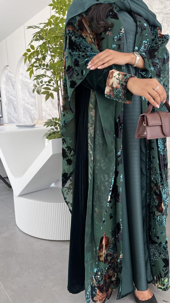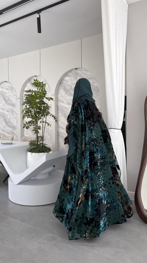 عباية مخمل ساده بقصه البشت باللون الزيتي تجمع بين السادة والمحفور في توازن راقٍ يبرز جمال القطعة وأناقتها.