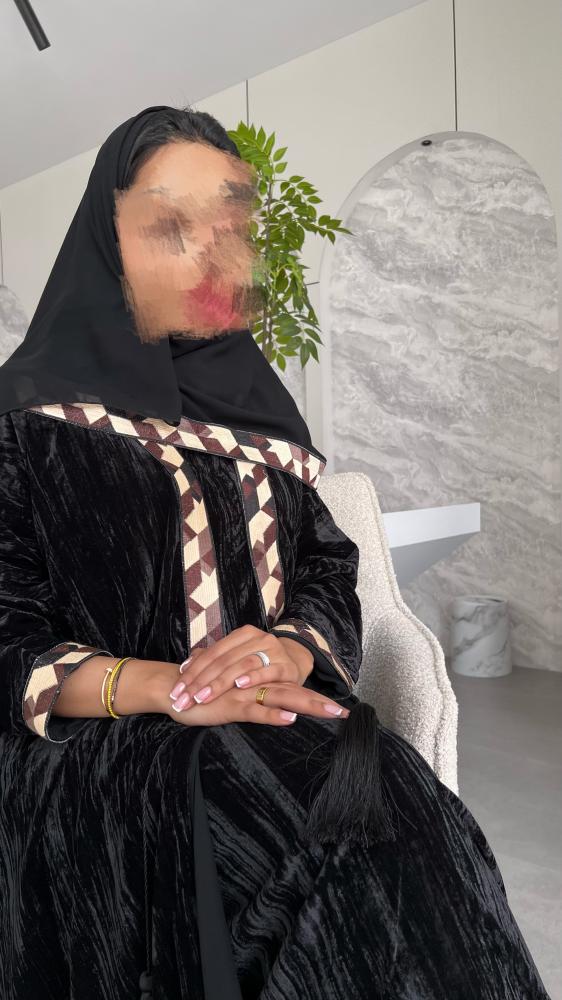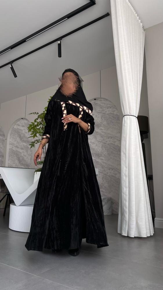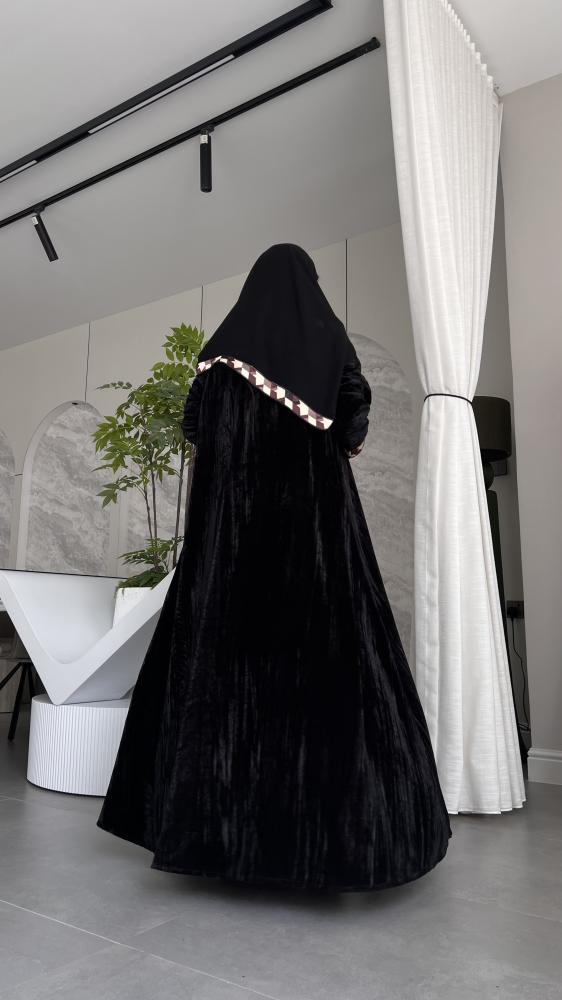 عباية بقماش مخمل أسود مع تطريز بالأكمام والياقه