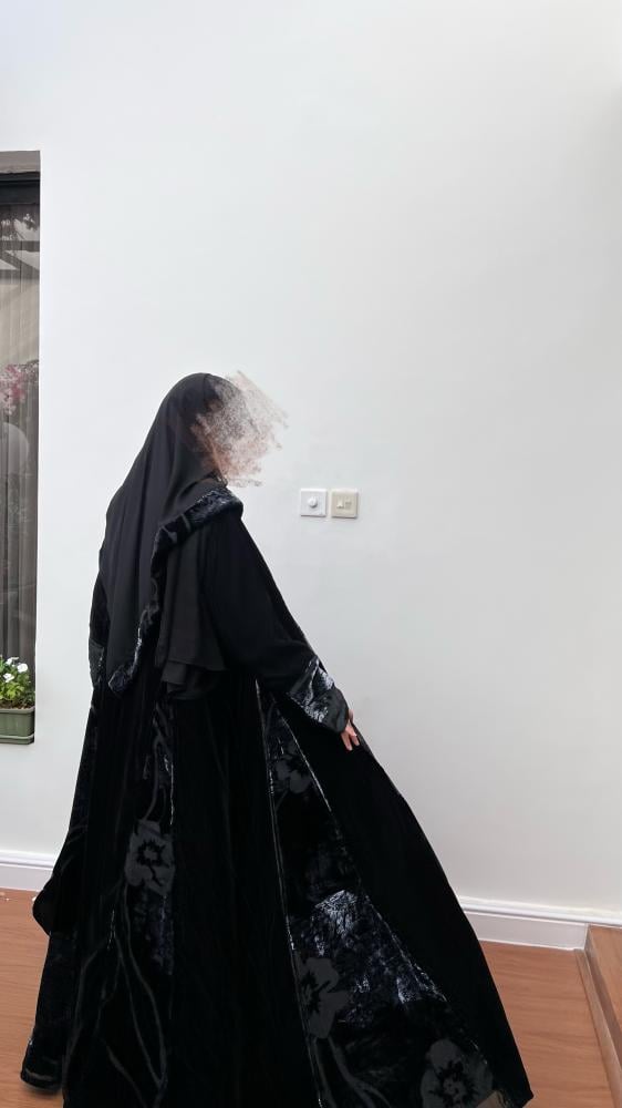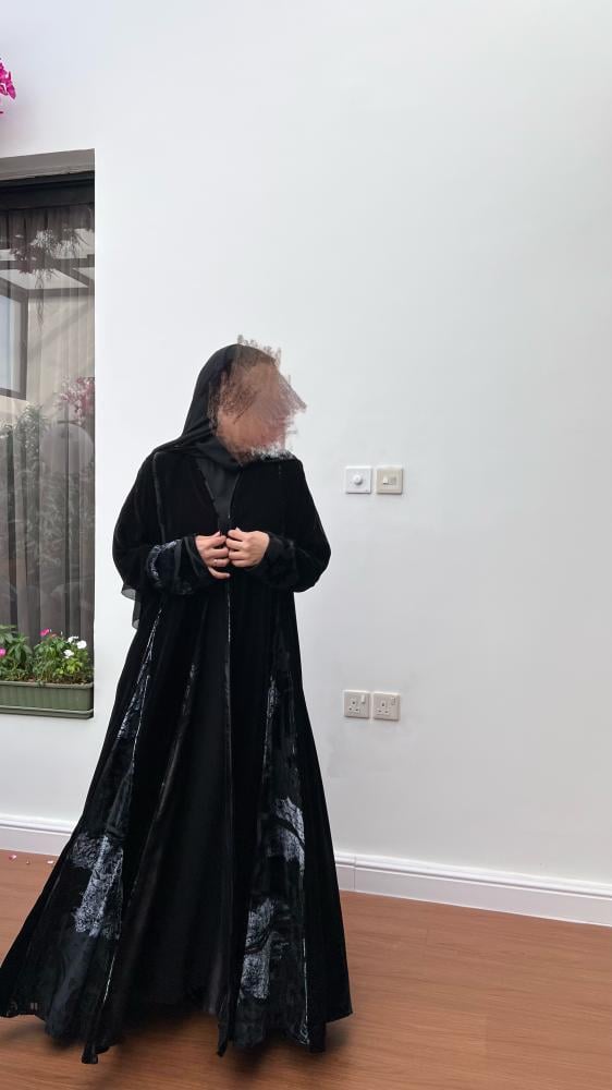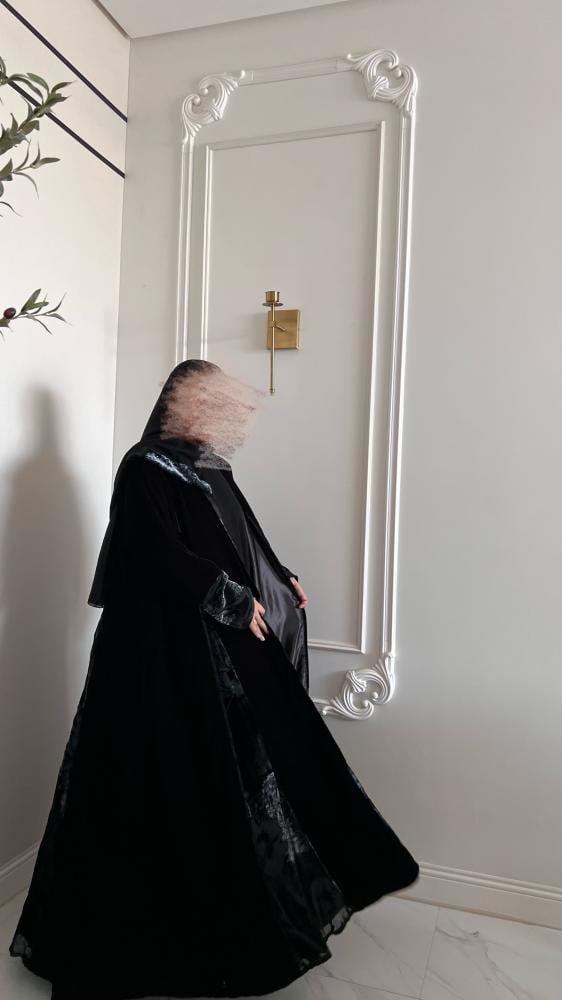 عباية مخمل قماش كوري باللون الأسود مع تدخيلات قماش مشجر