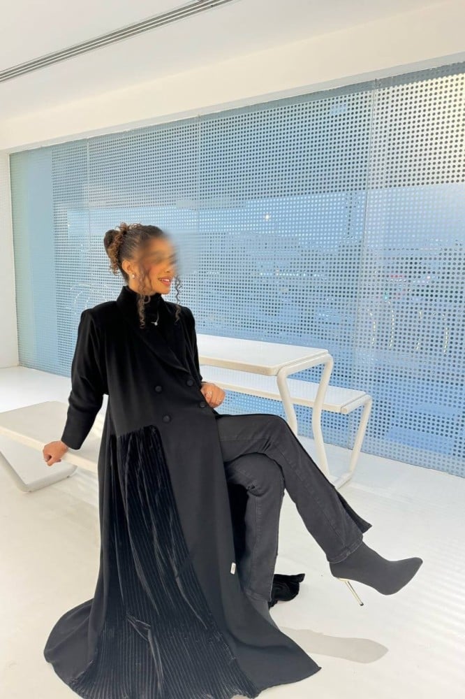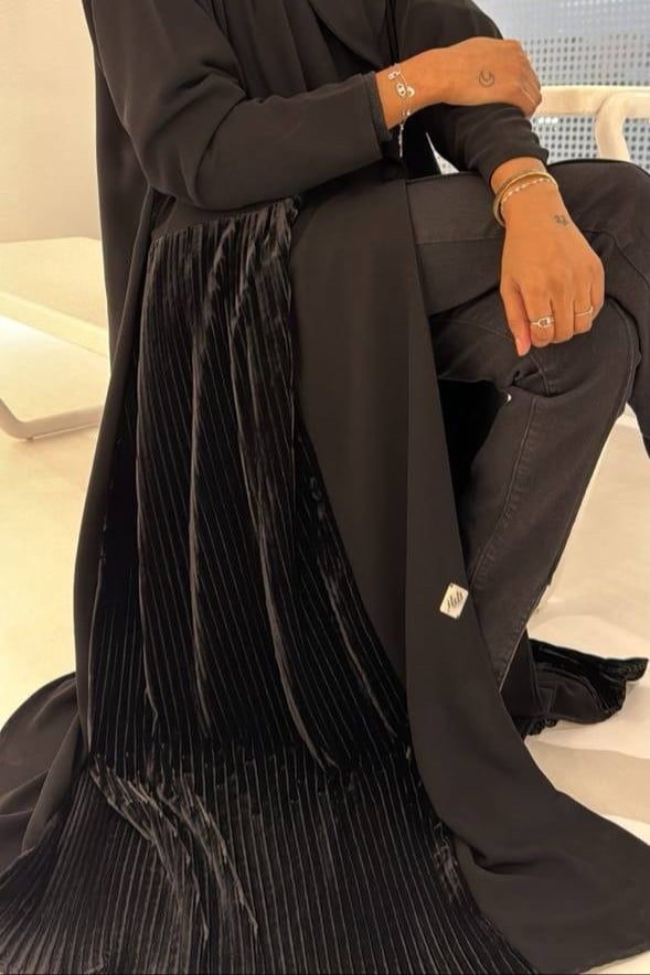 عباية رسمية وعملية باللون الأسود بكسرات من القماش المخمل
